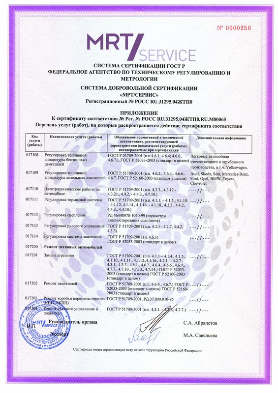 Организация располагает коллективом профессиональных автотехников: у нас выполняют антикоррозийную обработку кузова, замену масла, заправку и починку кондиционеров, кузовной ремонт, покраску и полировку кузова, ремонт автостекол, АКПП, выхлопных систем, двигателей (в том числе дизельных), подвески и электрооборудования, сход-развал, ремонт дисков, шиномонтаж. На услуги мастерской дается гарантия, срок которой может зависеть от специфики работ и использованных материалов.